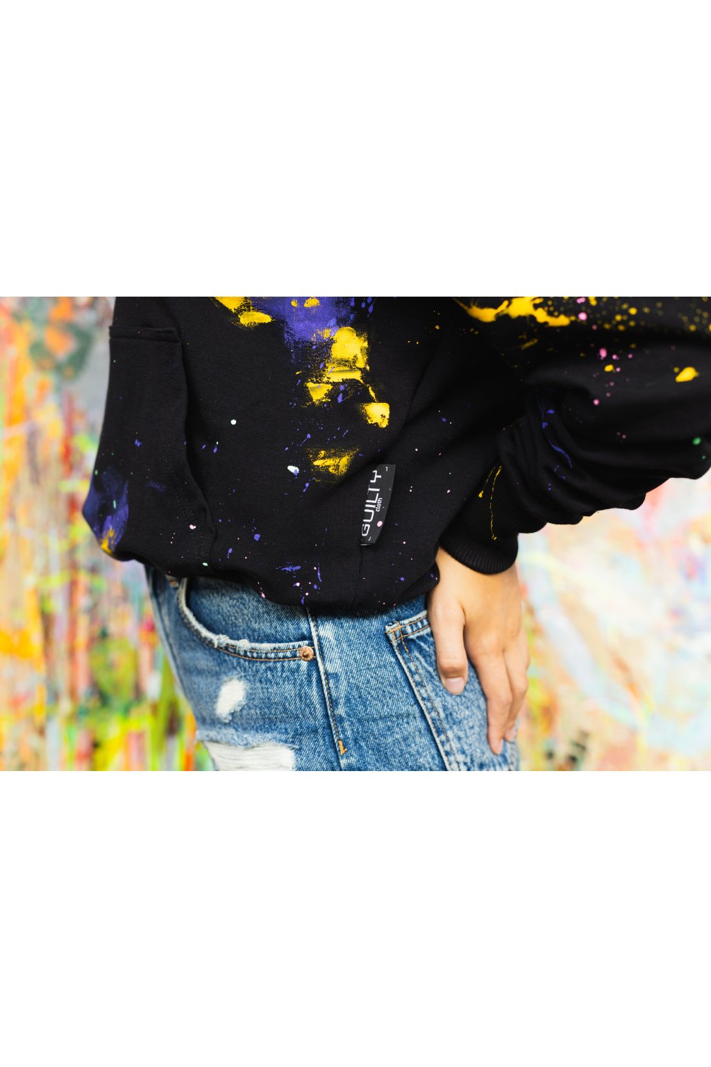 Čierna dámska oversize mikina GUILTY – ručne maľovaná – fialovo-žltý abstraktný vzor (limitovaná edícia) S