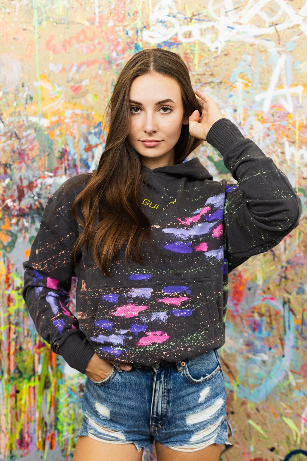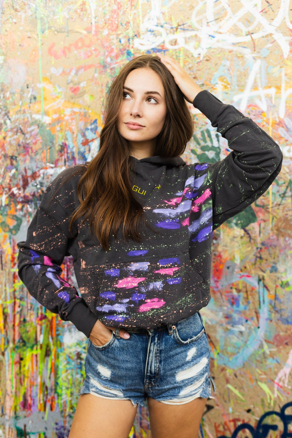 Táto sivá dámska mikina GUILTY je dôkazom, že streetwear môže byť nielen pohodlný, ale aj umelecký. Každý kus je ručne maľovaný, čo znamená, že vlastníš jediný originál na svete – žiadna mikina nie je rovnaká.
