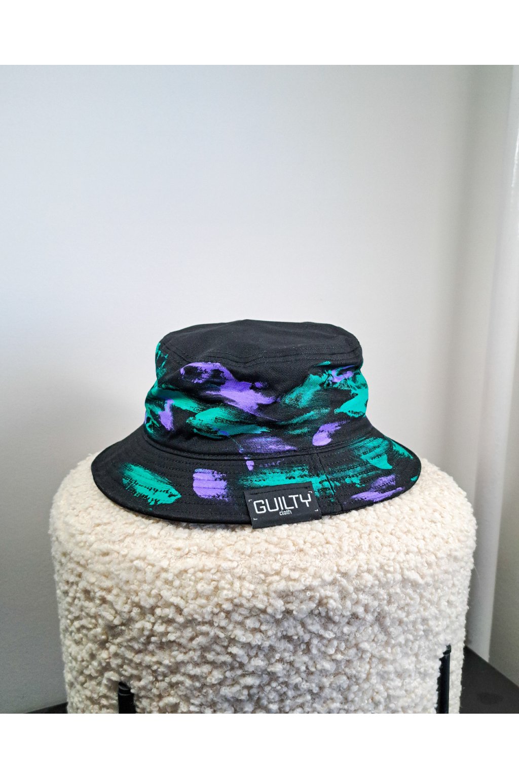 Tento čierny klobúk je ručne maľovaný odvážnou kombináciou tyrkysovej a fialovej farby, čím získava jedinečný umelecký charakter.