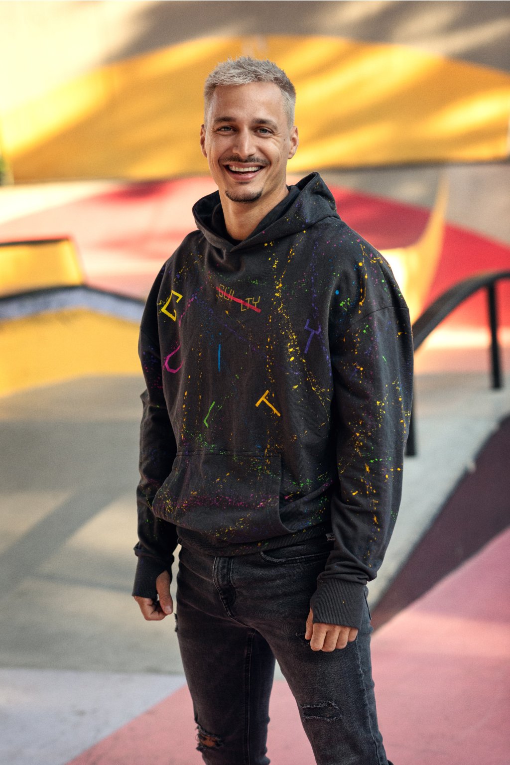 Táto šedá mikina GUILTY v sebe spája pohodlie, kvalitu a odvážny dizajn. Ručne maľovaný vzor inšpirovaný graffiti kultúrou prináša farebné písmená, žiarivé ťahy a kvapky v odtieňoch žltej, červenej, zelenej, modrej, fialovej a ružovej.
