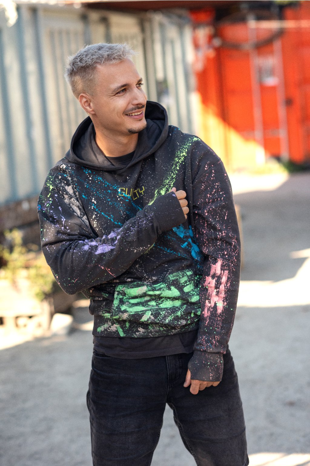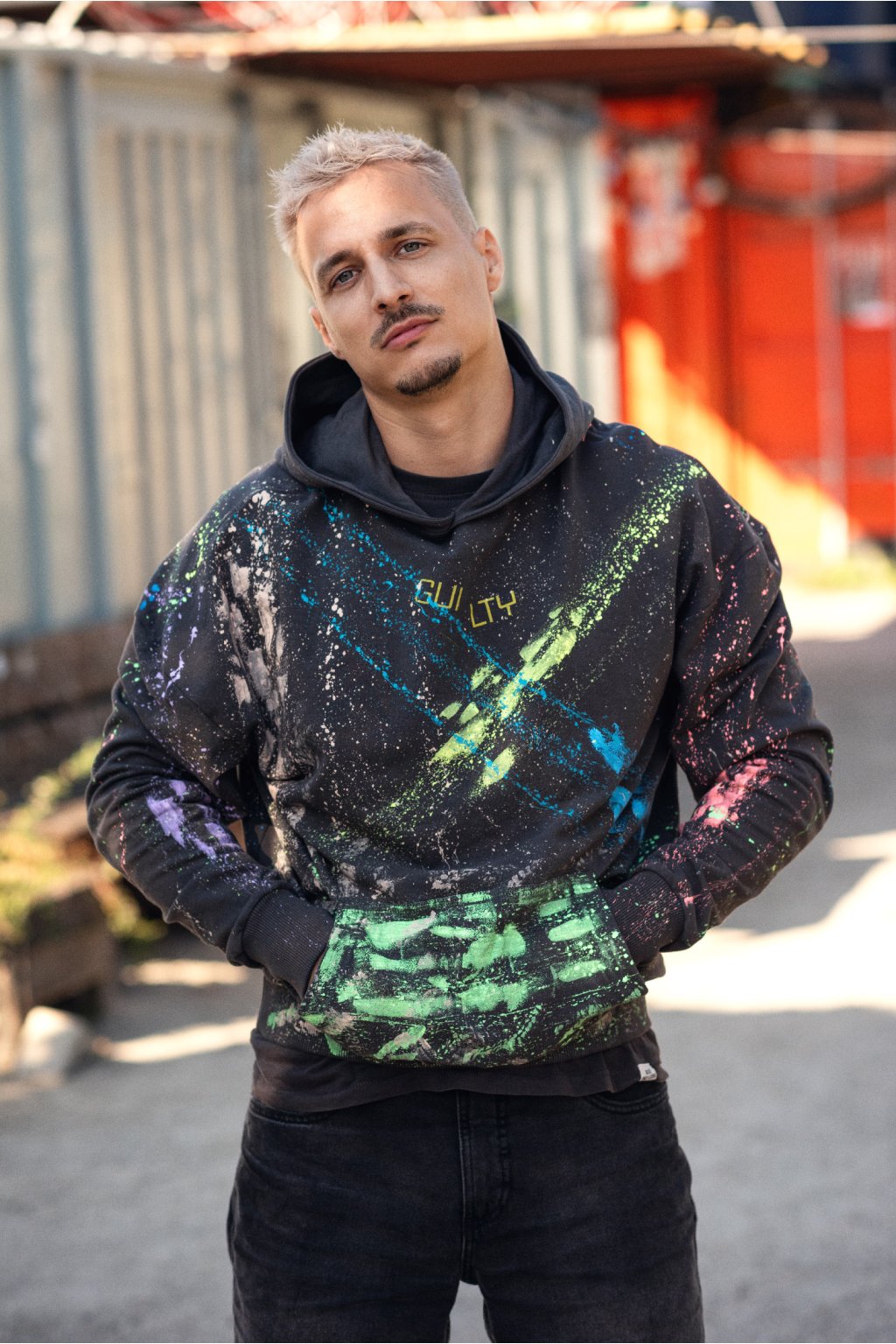 Táto šedá mikina GUILTY je stvorená pre tých, ktorí chcú, aby ich štýl svietil rovnako ako ich osobnosť. Ručne maľovaný abstraktný vzor kombinuje neonovo zelené, modré a ružové odtiene doplnené jemnými bielymi akcentmi, čím vytvára dynamický a moderný vzhľad.
