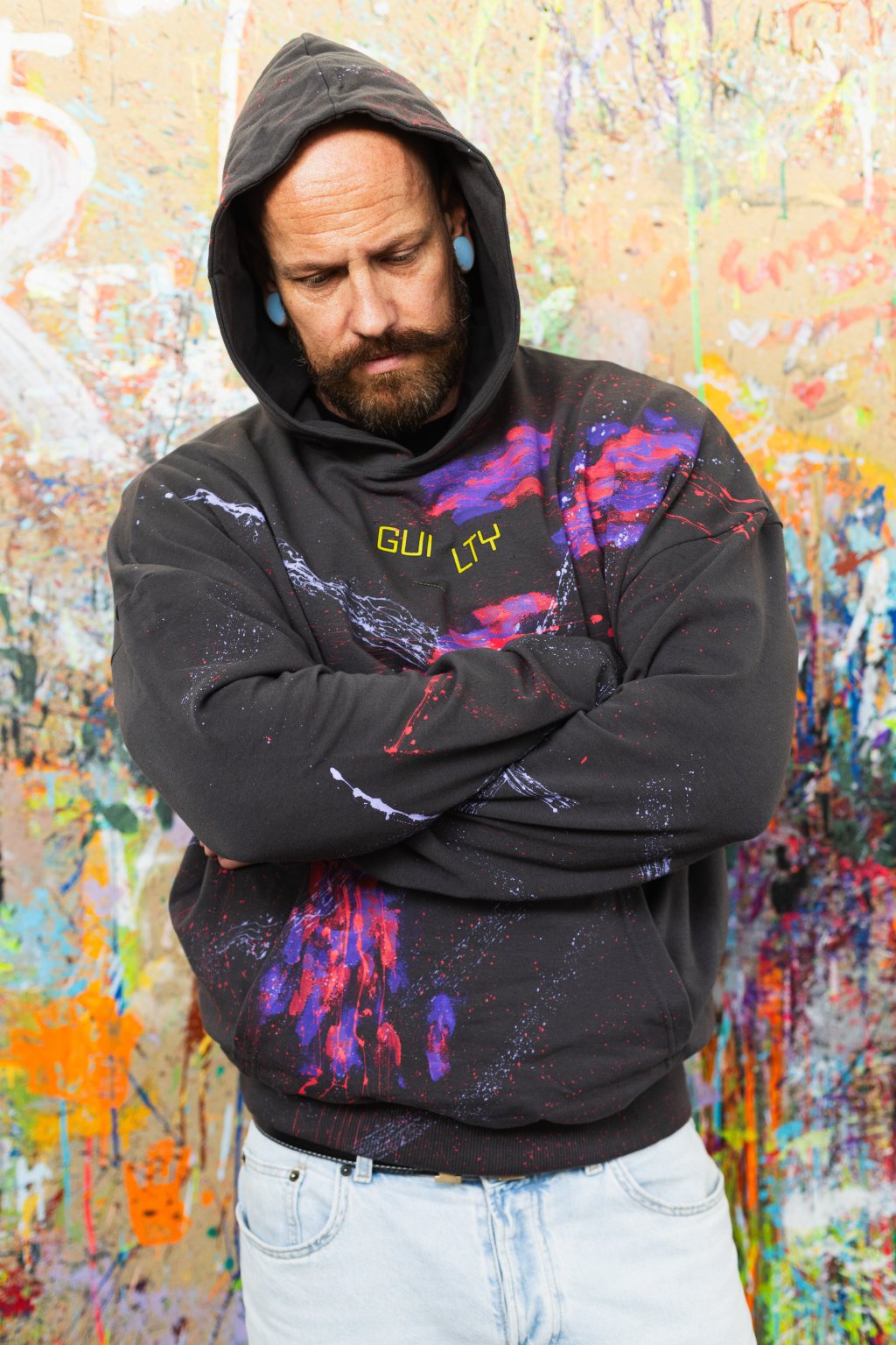 Táto sivá pánska mikina GUILTY je jedinečný kúsok streetwearu, ktorý spája umenie s módou. Každý kus je ručne maľovaný originál, takže rovnakú mikinu nikde inde nenájdete.