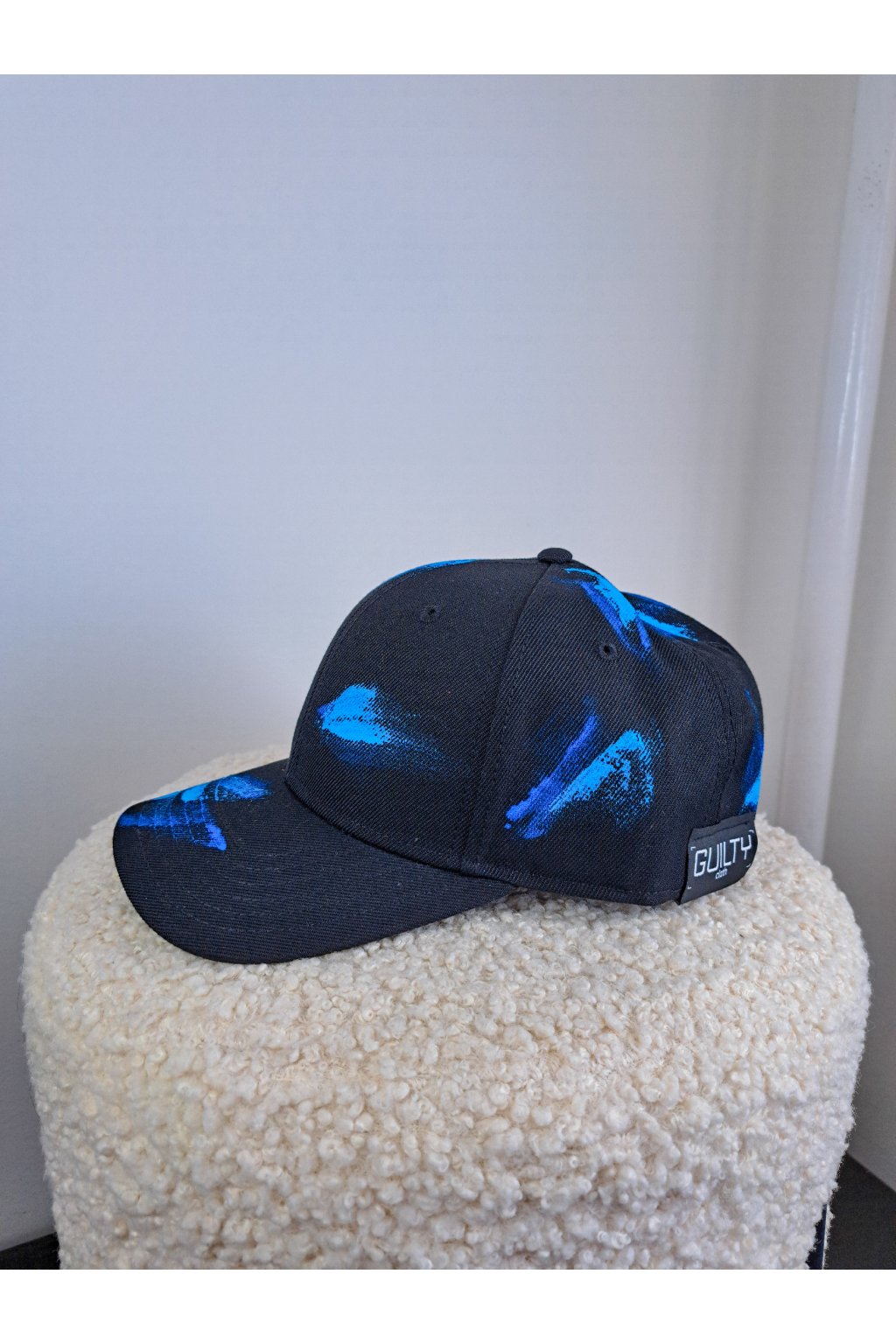 Vynikni v dave s limitovanou čiernou šiltovkou GUILTY, zdobenou ručne maľovanými modrými brush stroke detailmi.