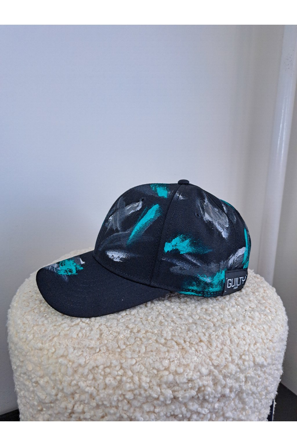 Posuň svoj štýl na novú úroveň s limitovanou čiernou šiltovkou GUILTY, ručne maľovanou smaragdovo-sivými brush stroke detailmi.