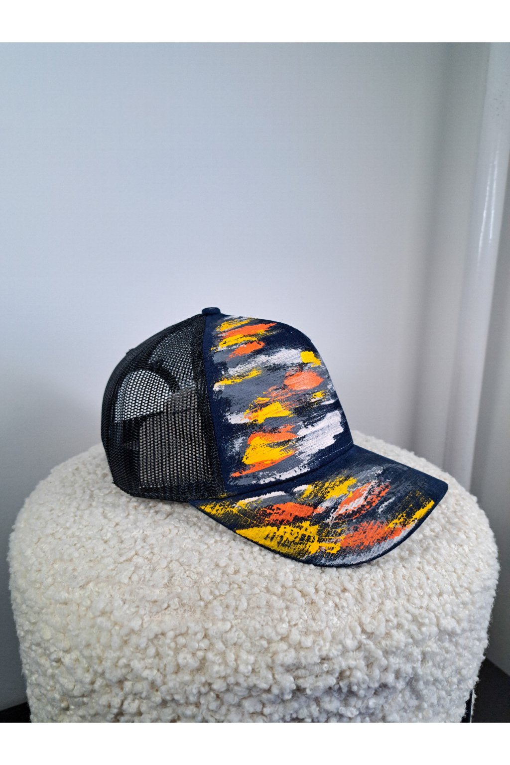 Priprav sa na silný vizuálny efekt s limitovanou modrou šiltovkou GUILTY so sieťkou, ručne maľovanou žlto–oranžovo–sivými brush-stroke vzormi.
