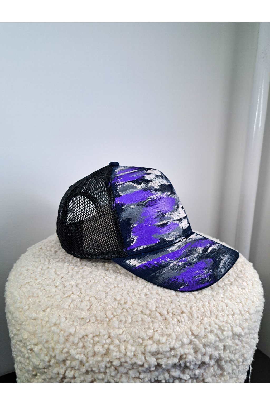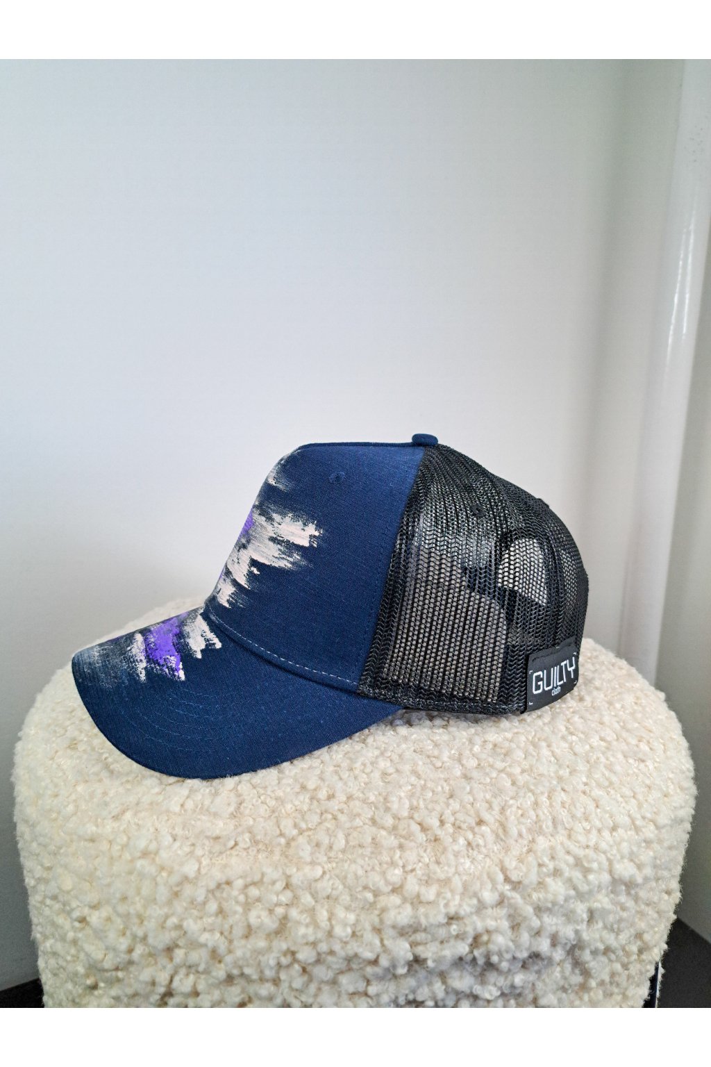 Priprav sa na neprehliadnuteľný štýl s modrou šiltovkou so sieťkou GUILTY, ručne maľovanou fialovo-bielo-sivými brush-stroke vzormi.