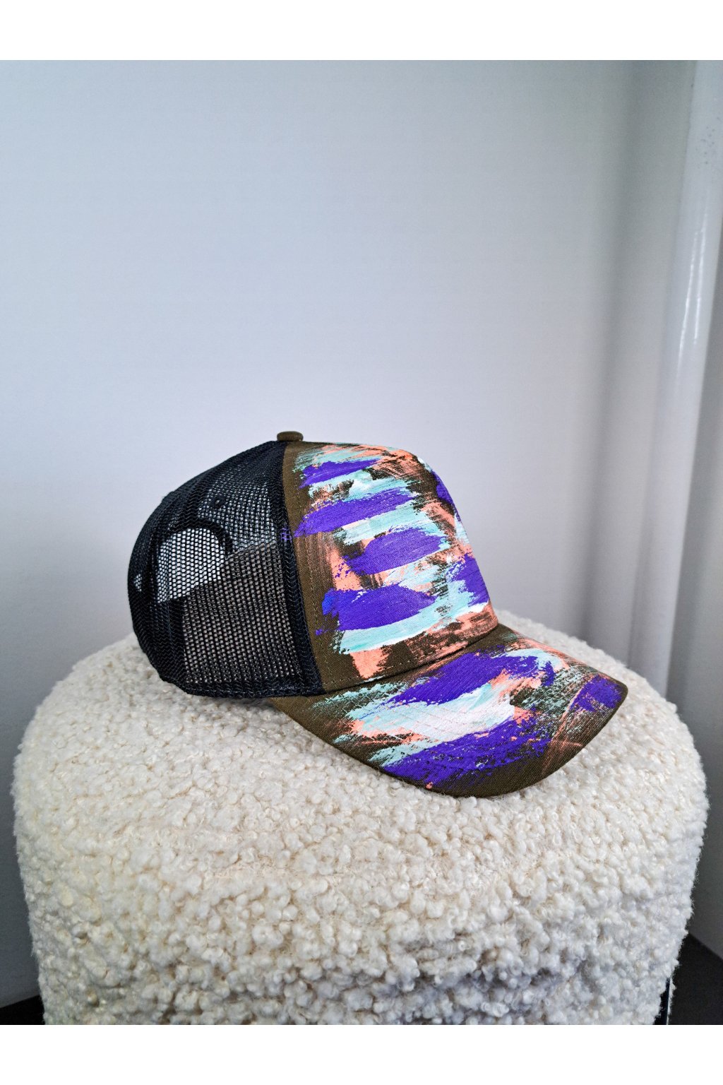 Štýlová zelená šiltovka so sieťkou GUILTY s ručne maľovanými fialovo-tyrkysovo-béžovými detailmi.